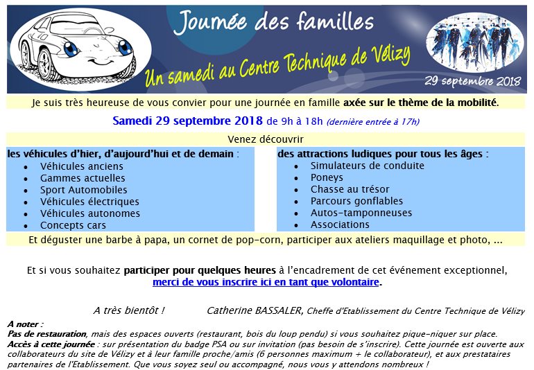 Une nouvelle Journée Porte Ouverte va être organisée sur le Centre Technique PSA de Vélizy le samedi 29 septembre 2018.