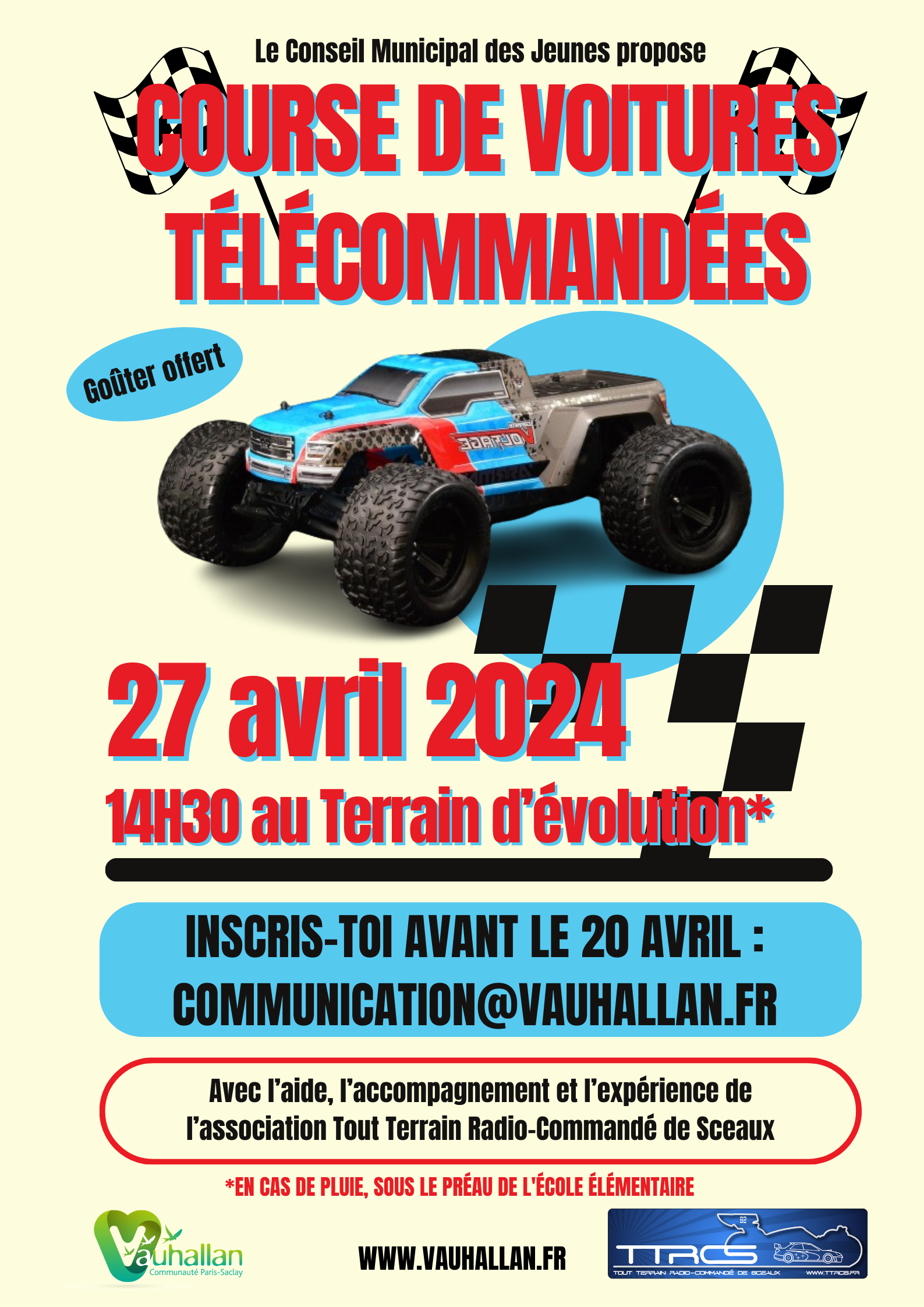 Le samedi 27 avril 2024, le TTRCS anime une rencontre RC avec le conseil Municipal des Jeunes de Vauhallan : il s'agit de l'un de leurs gros événements cette année et devrait permettre de rassembler les jeunes de la commune et des communes voisines.